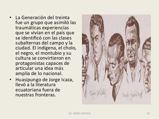 - 10. • La Generación del treinta fue un grupo que asimiló las traumáticas experiencias que se vivían en el país que se identificó con las clases subalternas del campo y la ciudad. El indígena, el cholo, el negro, el montubio y su cultura se convirtieron en protagonistas capaces de articular una idea más amplia de lo nacional. • Huasipungo de Jorge Icaza, llevó a la literatura ecuatoriana fuera de nuestras fronteras. LIC. JORGE CASTILLO 10