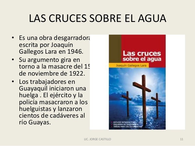 - 11. LAS CRUCES SOBRE EL AGUA • Es una obra desgarradora escrita por Joaquín Gallegos Lara en 1946. • Su argumento gira en torno a la masacre del 15 de noviembre de 1922. • Los trabajadores en Guayaquil iniciaron una huelga . El ejército y la policía masacraron a los huelguistas y lanzaron cientos de cadáveres al río Guayas. LIC. JORGE CASTILLO 11