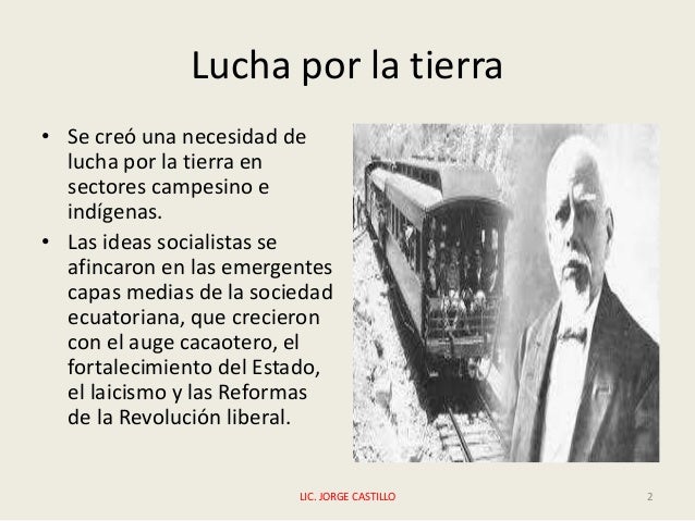 - 2. Lucha por la tierra • Se creó una necesidad de lucha por la tierra en sectores campesino e indígenas. • Las ideas socialistas se afincaron en las emergentes capas medias de la sociedad ecuatoriana, que crecieron con el auge cacaotero, el fortalecimiento del Estado, el laicismo y las Reformas de la Revolución liberal. LIC. JORGE CASTILLO 2