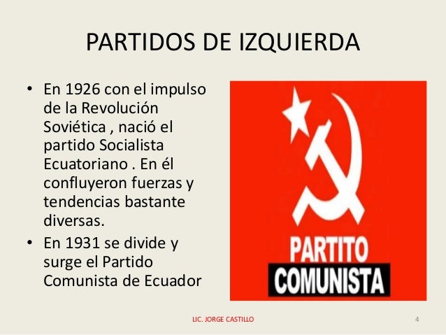 - 4. PARTIDOS DE IZQUIERDA • En 1926 con el impulso de la Revolución Soviética , nació el partido Socialista Ecuatoriano . En él confluyeron fuerzas y tendencias bastante diversas. • En 1931 se divide y surge el Partido Comunista de Ecuador LIC. JORGE CASTILLO 4
