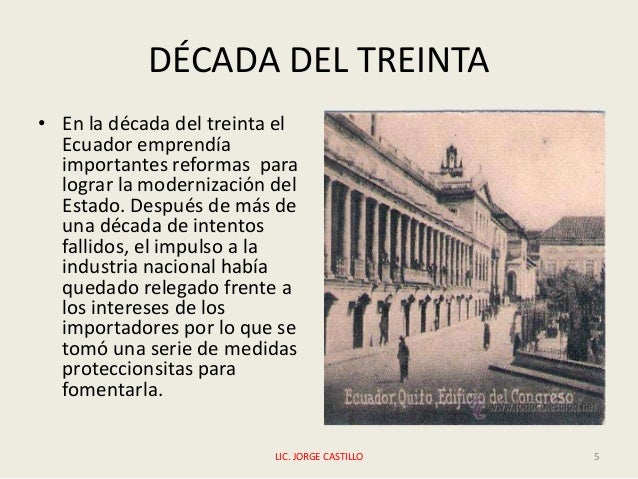 - 5. DÉCADA DEL TREINTA • En la década del treinta el Ecuador emprendía importantes reformas para lograr la modernización del Estado. Después de más de una década de intentos fallidos, el impulso a la industria nacional había quedado relegado frente a los intereses de los importadores por lo que se tomó una serie de medidas proteccionsitas para fomentarla. LIC. JORGE CASTILLO 5