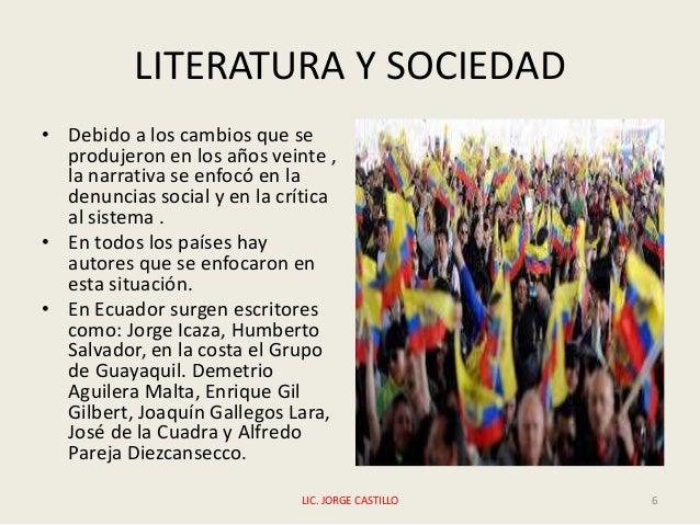- 6. LITERATURA Y SOCIEDAD • Debido a los cambios que se produjeron en los años veinte , la narrativa se enfocó en la denuncias social y en la crítica al sistema . • En todos los países hay autores que se enfocaron en esta situación. • En Ecuador surgen escritores como: Jorge Icaza, Humberto Salvador, en la costa el Grupo de Guayaquil. Demetrio Aguilera Malta, Enrique Gil Gilbert, Joaquín Gallegos Lara, José de la Cuadra y Alfredo Pareja Diezcansecco. LIC. JORGE CASTILLO 6