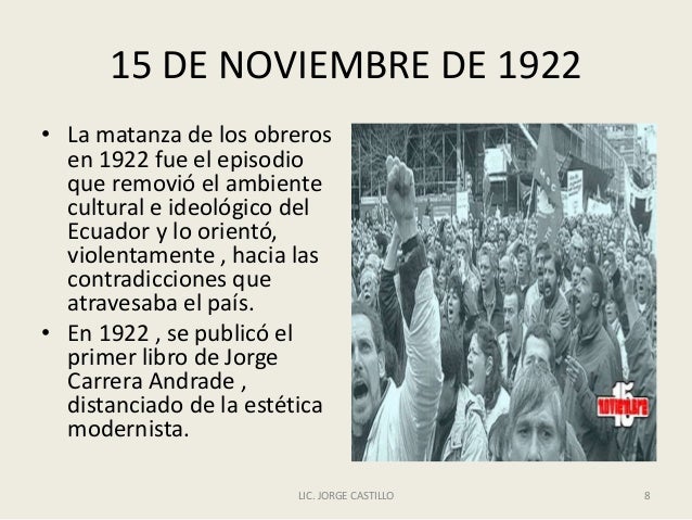 - 8. 15 DE NOVIEMBRE DE 1922 • La matanza de los obreros en 1922 fue el episodio que removió el ambiente cultural e ideológico del Ecuador y lo orientó, violentamente , hacia las contradicciones que atravesaba el país. • En 1922 , se publicó el primer libro de Jorge Carrera Andrade , distanciado de la estética modernista. LIC. JORGE CASTILLO 8