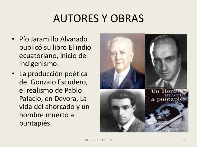 - 9. AUTORES Y OBRAS • Pío Jaramillo Alvarado publicó su libro El indio ecuatoriano, inicio del indigenismo. • La producción poética de Gonzalo Escudero, el realismo de Pablo Palacio, en Devora, La vida del ahorcado y un hombre muerto a puntapiés. LIC. JORGE CASTILLO 9